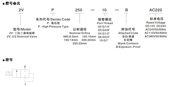 ▲ 欲訂購接管螺紋為G3/8",標準電壓為DC24V,公稱(chēng)通徑為20mm,2VP系列電磁閥,其正確的訂購碼為:2VP200-03-DC24V