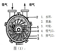 如圖(1)所示2BV水環(huán)真空泵葉輪3偏心地安裝在泵體之內,起動(dòng)時(shí)向泵內注入一定高度的水,因此當葉輪3旋轉時(shí),水受離心力的作用而在泵體內壁形成一旋轉水環(huán)1,水環(huán)下部?jì)缺砻媾c輪轂相切,沿箭頭方向旋轉,在前半轉過(guò)程中,水環(huán)內表面逐漸與輪轂脫離,因此在葉輪葉片間功與水環(huán)形成封閉空間,隨著(zhù)葉輪的旋轉,該空間逐漸擴大,空間氣體壓力降低,氣體自圓盤(pán)吸氣被吸入;在后半轉過(guò)程中,水環(huán)內表面逐漸與輪轂靠近,葉片空間逐漸縮小,空間氣體壓力升高,高于排氣口壓力時(shí),葉片間的氣體自圓盤(pán)排氣口被排出。如此葉輪每轉動(dòng)一周,葉片間的空間吸排氣一次,許多空間不停地工作,2BV水環(huán)式真空泵就連續不斷地抽吸或壓送氣體。
