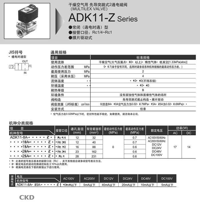 ADK11-8A,ADK11-10A,ADK11-15A,ADK11-20A,ADK11-25A,CKD先導式式2通電磁閥