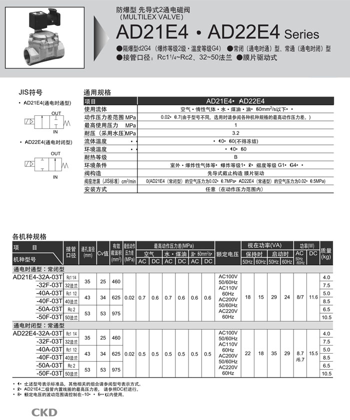 AD22E4-32A,AD22E4-32F,AD22E4-40A,AD22E4-40F,AD22E4-50A,AD22E4-50F,CKD先導式2通電磁閥