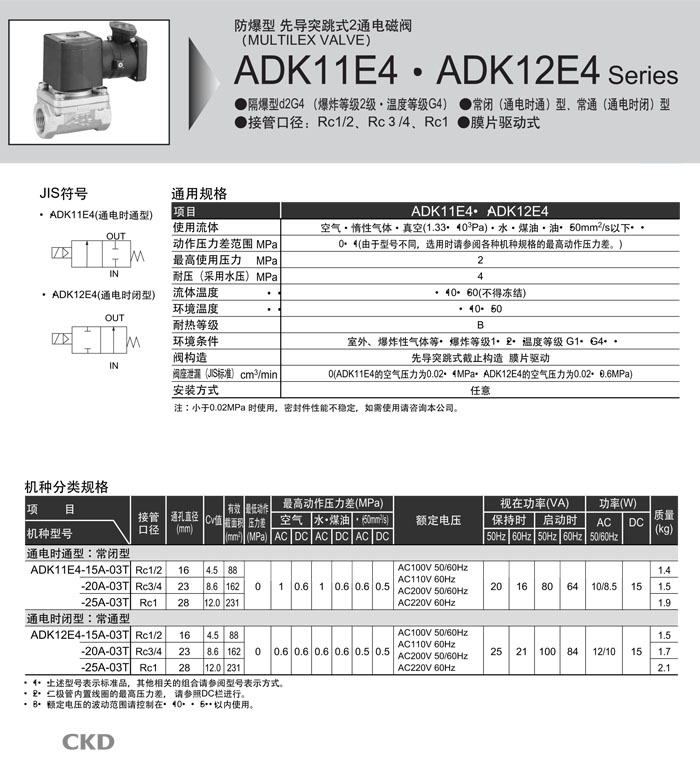 ADK11E4-15A,ADK11E4-20A,ADK11E4-25A,ADK12E4-15A,ADK12E4-20A,ADK12E4-25A,CKD先導式2通電磁閥