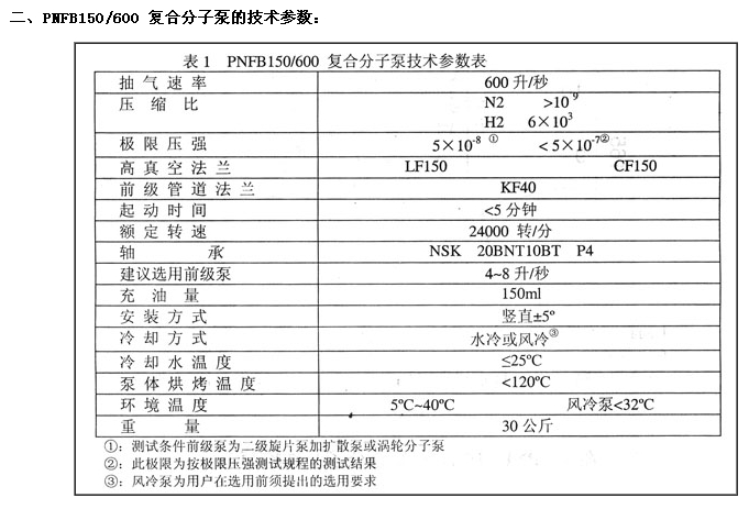 二、PNFB150/600 復合分子泵的技術(shù)參數: