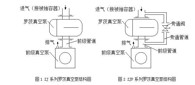 二、ZJ系列羅茨真空泵在較低入口壓力時(shí)具有較高的抽氣速率,但它不能單獨使用,必須有一臺前級真空泵串聯(lián),待被抽系統中的壓力被前級真空泵抽到羅茨真空泵允許的入口壓力時(shí),羅茨真空泵才開(kāi)始工作(見(jiàn)圖1)。