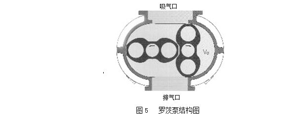 羅茨泵的結構見(jiàn)圖5。在泵腔內,有一對8字形的轉子相互垂直地安裝在一對平行軸上,由傳動(dòng)比為1的一對齒輪帶動(dòng)作彼此反向的同步旋轉運動(dòng)。在轉子之間,轉子與泵殼內壁之間,保持有一定的間隙,可以實(shí)現高轉速運行。由于羅茨泵是一種無(wú)內壓縮的真空泵,通常壓縮比很低,故需要前級泵。羅茨泵的極限真空除取決于泵本身結構和制造精度外,還取決于前級泵的極限真空。為了提高泵的極限真空度,可將羅茨泵串聯(lián)使用羅茨泵的工作原理與羅茨鼓風(fēng)機相似。由于轉子的不斷旋轉,被抽氣體從吸氣口吸入到轉子與泵殼之間的空間VO內,再經(jīng)排氣口排出。由于吸氣后VO空間是全封閉狀態(tài),所以,在泵腔內氣體沒(méi)有壓縮和膨脹。