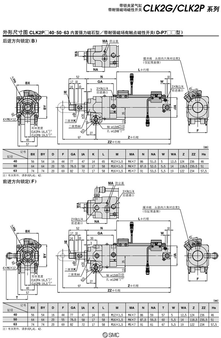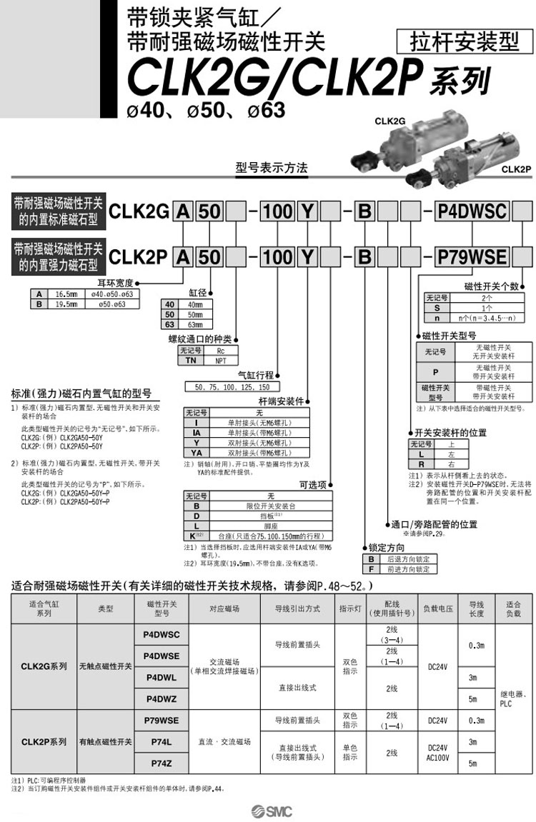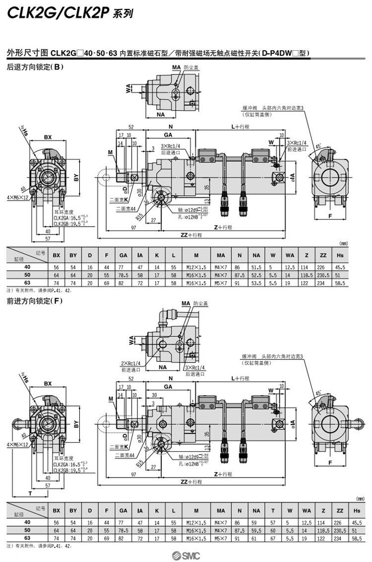 CLK2GA40-50,CLK2GA50-50,CLK2GA63-50,CLK2GB40-50,CLK2GB50-50,CLK2GB63-50,SMC帶鎖夾緊氣缸
