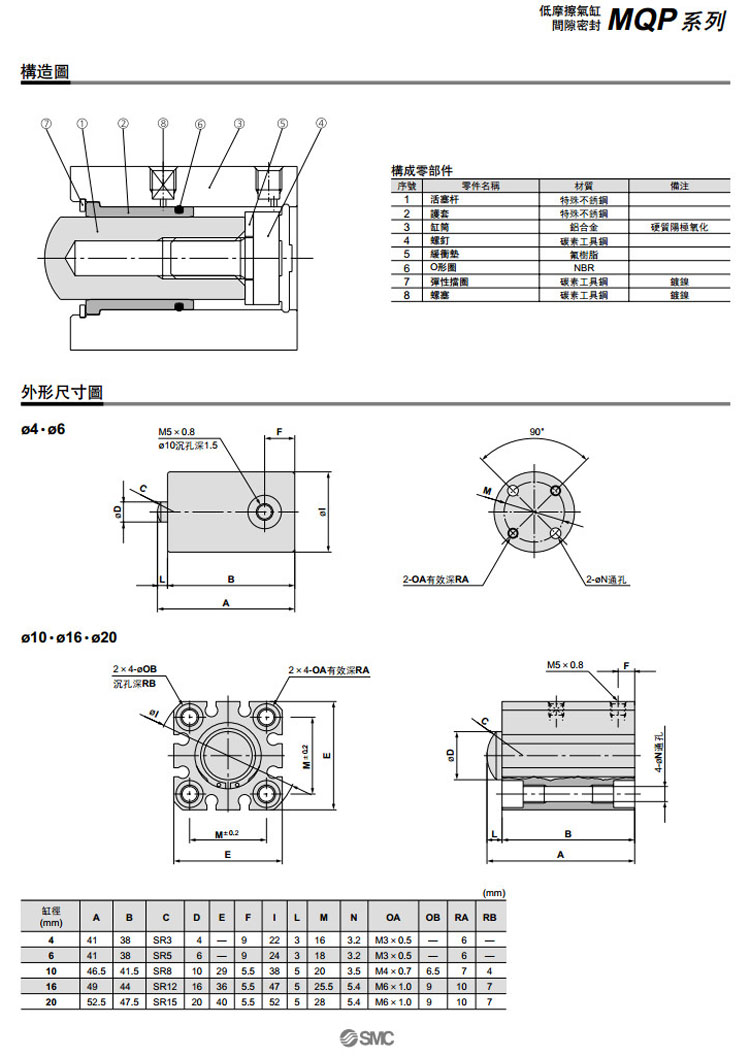 MQP4-10S,MQP6-10S,MQP10-10S,MQP16-10S,MQP20-10S,SMC低摩擦氣缸