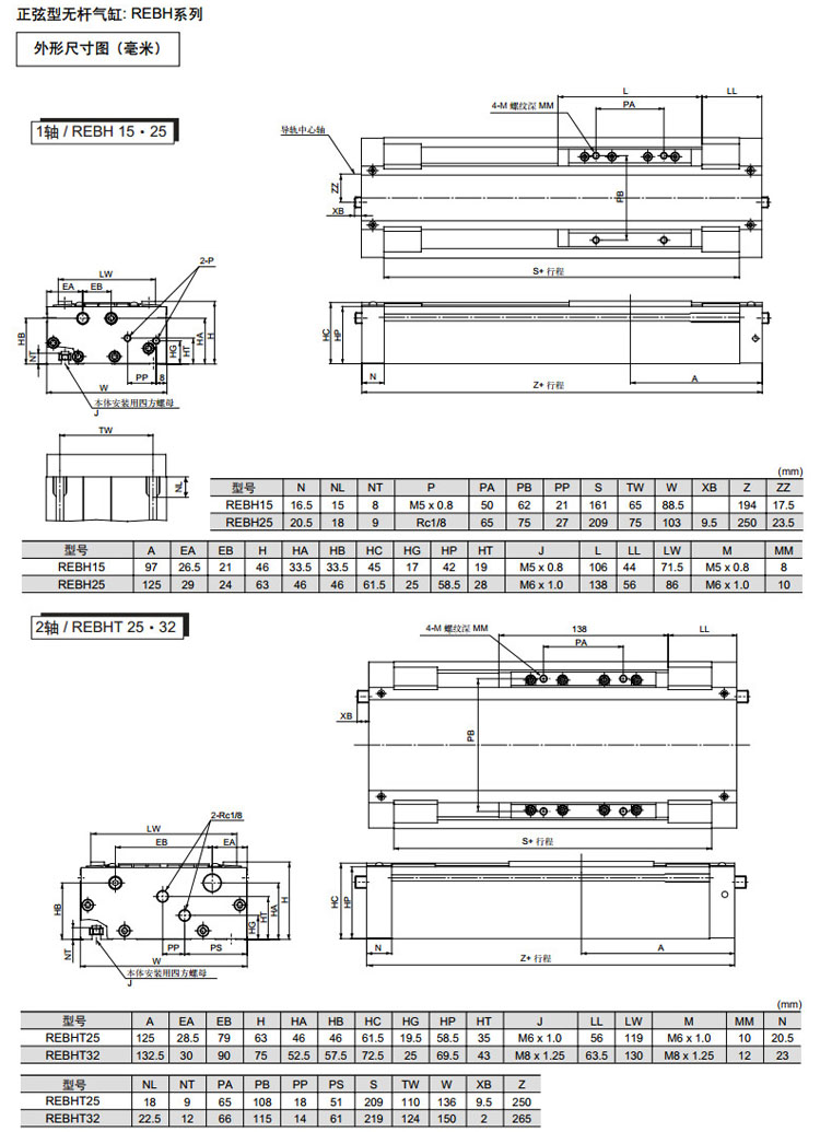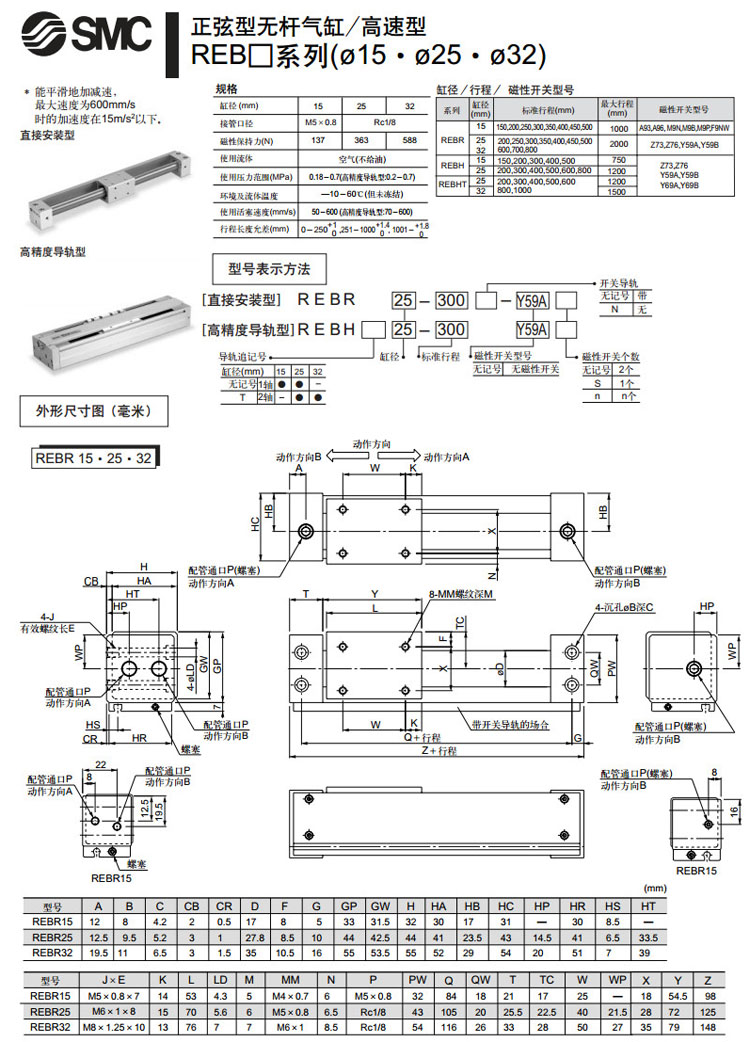 REBR15-150,REBR25-200,REBR32-200,REBH15-150,REBH25-200,REBHT25-200,REBHT32-200,SMC正弦無(wú)桿氣缸