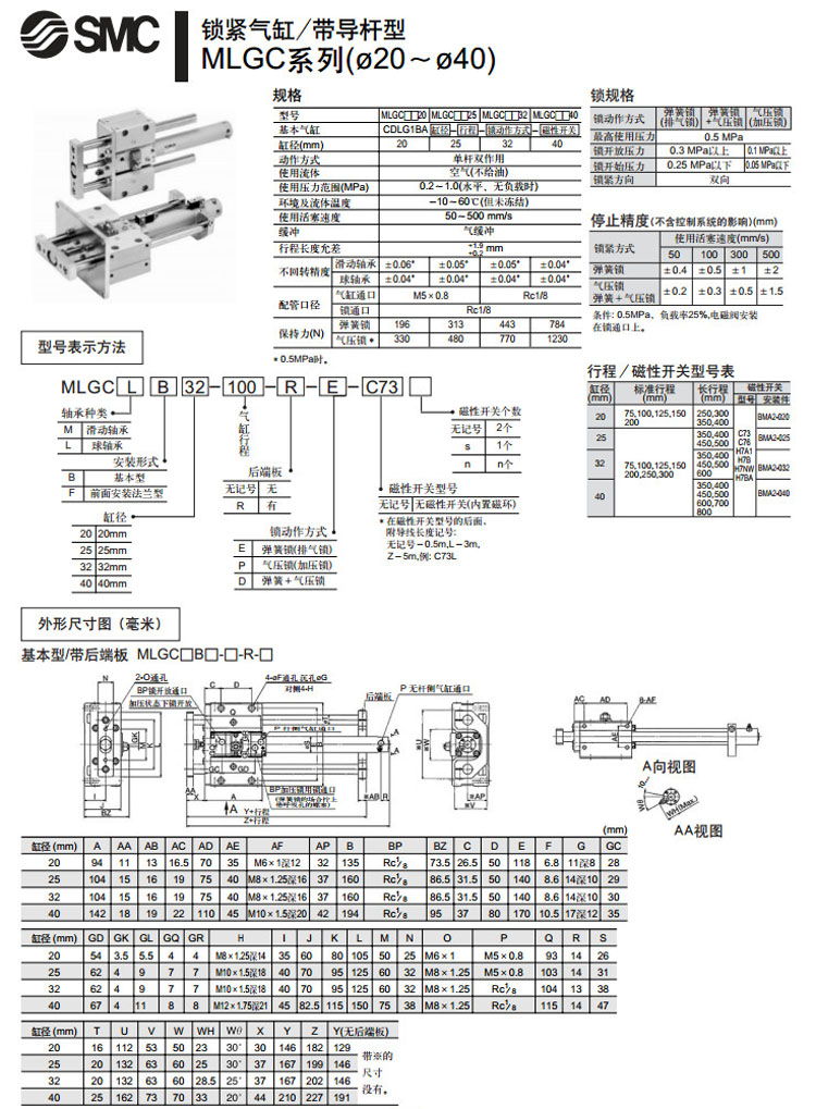 MLGCMB20-75,MLGCMF20-75,MLGCLB20-75,MLGCLF20-75,MLGCMB20-100,MLGCLF20-200,SMC帶導桿型鎖緊氣缸