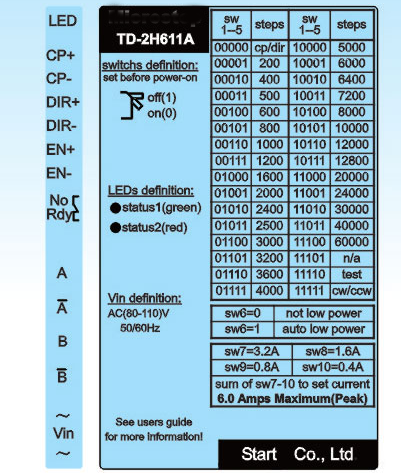TD-2H611A型步進(jìn)驅動(dòng)器,主要用于驅動(dòng)110型、相電流為6.0A及以下的二相混合式電機.其運行步數(細分數)達到28種,最大步數6萬(wàn),通過(guò)撥位開(kāi)關(guān)的第1-5 位來(lái)設定步數.具有單雙脈沖方式,自測試功能,相位記憶功能,自動(dòng)半電流功能.本驅動(dòng)器可以輸出的最大電流為6.0A(峰值),可以很方便的通過(guò)撥位開(kāi)關(guān)的第7-10位來(lái)設定你需要的輸出電流(可以設定16檔電流,設定分辨率0.4A)。本驅動(dòng)器一般采用交流供電,Vin電壓下限值AC70V、上限值AC140V、典型值AC80V和AC110V其供電功率不小于400W.