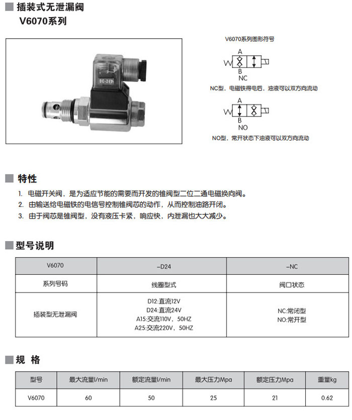 V6070-D24-NC,V6070-D24-NO,V6070-D12-NC,V6070-D12-NO,V6070-A15-NC,V6070-A15-NO,插裝式無(wú)泄漏閥