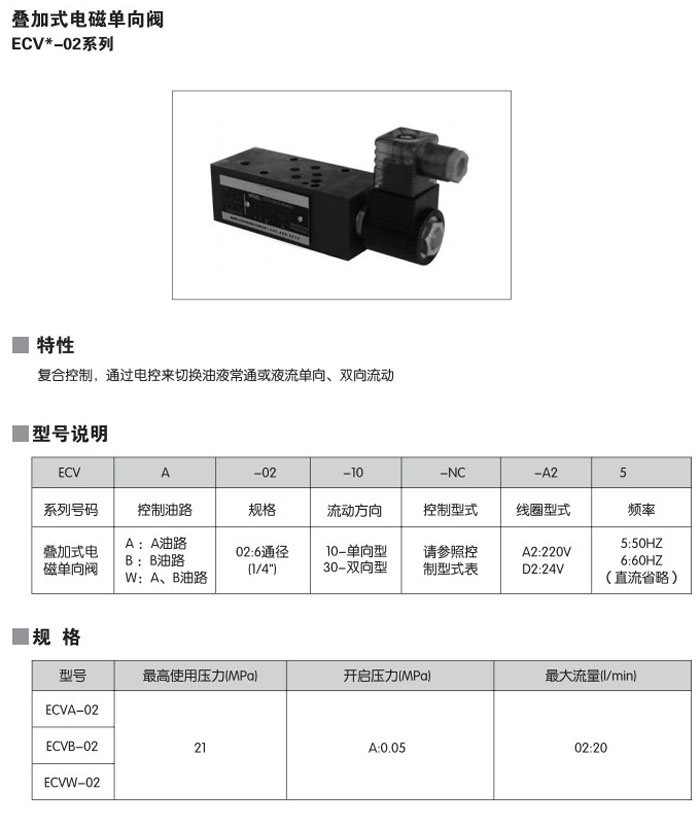 ECVA-02,ECVB-02,ECVW-02,ECVA-02-10-NO-A2,ECVA-02-30-NO-A2,疊加式電磁單向閥