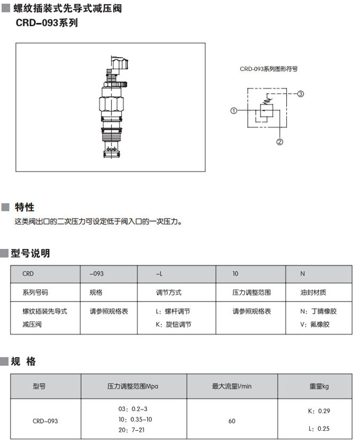 CRD-093-L03N,CRD-093-L10N,CRD-093-L20N,CRD-093-K03N,CRD-093-K10N,CRD-093-L30N,螺紋插裝式先導式減壓閥
