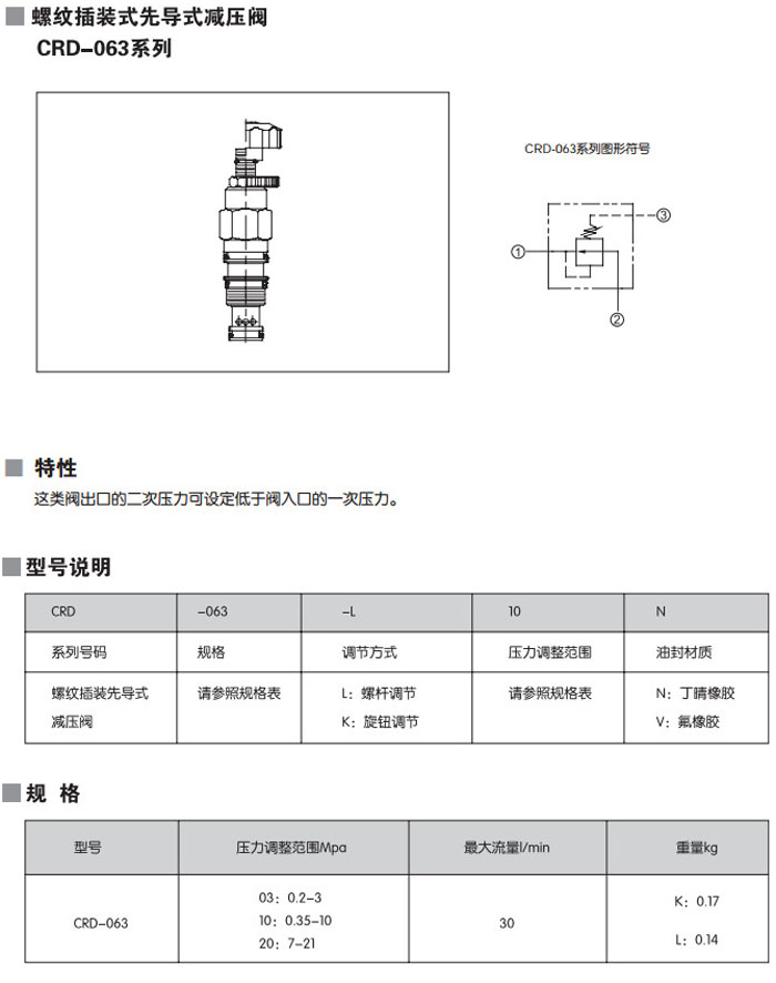 CRD-063-L03N,CRD-063-L10N,CRD-063-L20N,CRD-063-K03N,CRD-063-K10N,CRD-063-L30N,螺紋插裝式先導式減壓閥