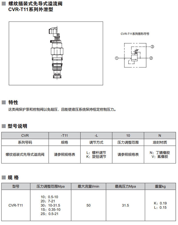 CVR-T11-L10N,CVR-T11-K10N,CVR-T11-L20N,CVR-T11-L30N,CVR-T11-L1SN,CVR-T11-L2SN,螺紋插裝式先導式溢流閥