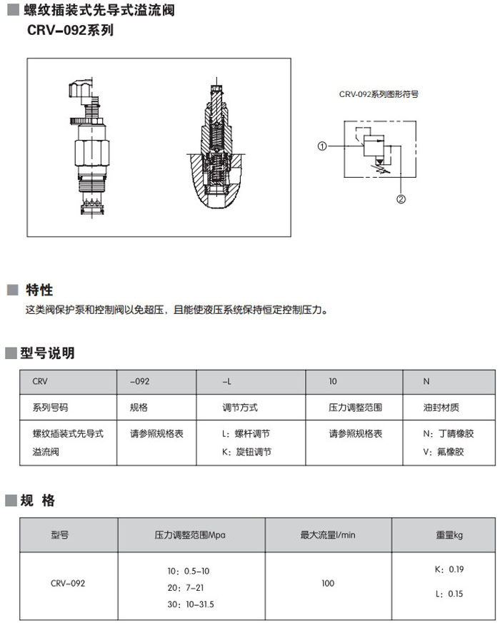 CRV-092-L10N,CRV-092-L20N,CRV-092-L30N,CRV-092-K10N,CRV-092-K20N,CRV-092-K30N,螺紋插裝式先導式溢流閥