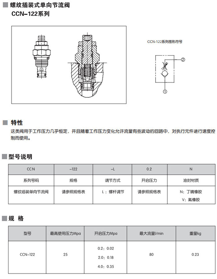 CCN-122-L0.2N,CCN-122-L2.0N,CCN-122-L4.0N,CCN-122-L0.2V,CCN-122-L2.0V,CCN-122-L4.0V,螺紋插裝式單向節流閥