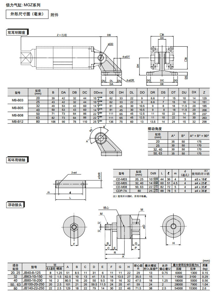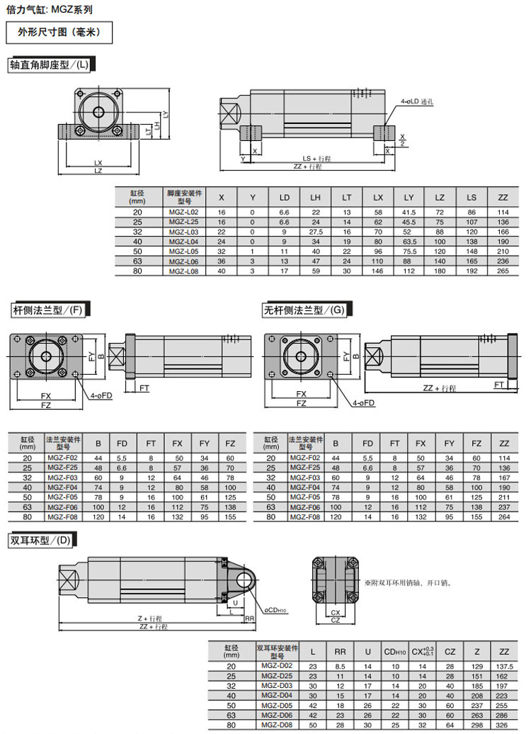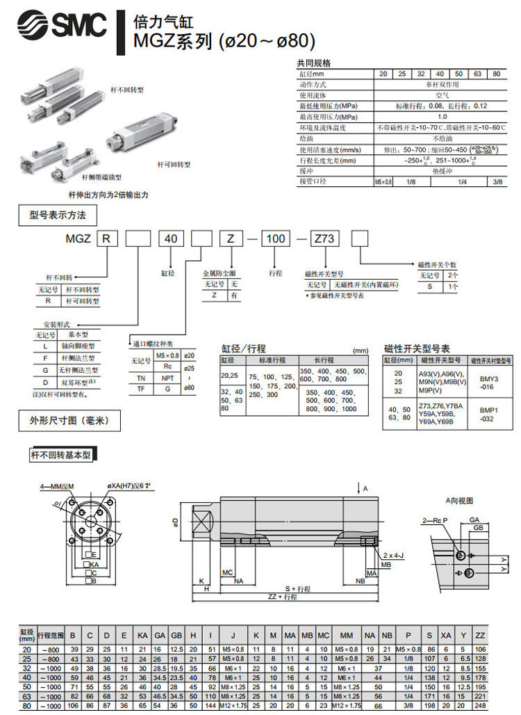 MGZ20,MGZ25,MGZ32,MGZ40,MGZ50,MGZ63,MGZ80,MGZ20-75,MGZ20Z-75,SMC桿不回轉倍力氣缸